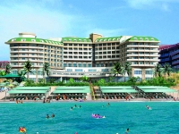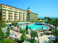 в 90 км от аэропорта г. Анталья, в 33 км от г. Аланья, в 27 км от г. Сиде, в 500 м от поселка Окурджалар, на самом берегу моря.